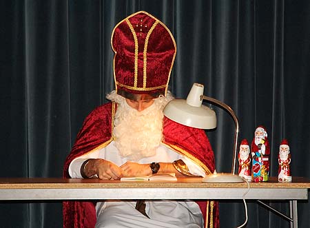 Die Zeit, in der die Sechstklässler allesamt in angespannter Erwartung der Entscheidungsverkündung in der Aula ausharrten, wurde dazu genutzt, die vorweihnachtliche Geschichte zu Ende zu lesen. Die Rolle des Vorlesers übernahm kein geringerer als der leibhaftige Nikolaus! Seines Amtes würdig verteilte er zudem an alle wartenden Kinder eine kleine süße Überraschung.
