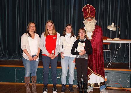 Frau Keyser (links) und der Nikolaus lobten die Teilnehmer und ehrten die Schulsiegerin.