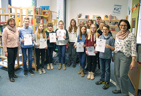 Die jungen Nachwuchsforscher des RWG nahmen die Glückwünsche der Schuleiterin Ursula Graf (links) und ihrer betreuenden Lehrerin Sabine Fröber (rechts) entgegen.