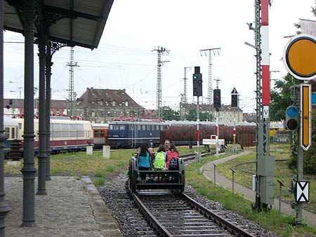 Eine weitere Attraktion für die Schüler/innen war sicherlich auch die Fahrt mit der Handhebel-Draisine auf dem Freigelände des Museums. Das mit Muskelkraft betriebene Laufrad, gleichzeitig Vorläufer des Schienenfahrzeuges, ist ungefähr so alt wie die Eisenbahn selbst; auf die Schiene gesetzt, wurden Draisinen zur Streckenkontrolle und für Instandsetzungsarbeiten verwendet, aber auch, um Post zu transportieren.