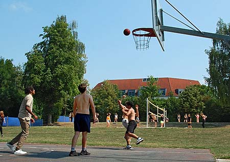 Für die Freunde der großen, schnellen Gummikugel war der Basketballplatz da: Man konnte hier kleine Spiele austragen oder einfach nur das Dribbling oder der Versenken der Bälle im Korb üben. Auch das ging ganz ohne Stress, Zoff und Streit, denn man wollte ja einen relaxten, schönen Vormittag haben.