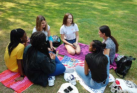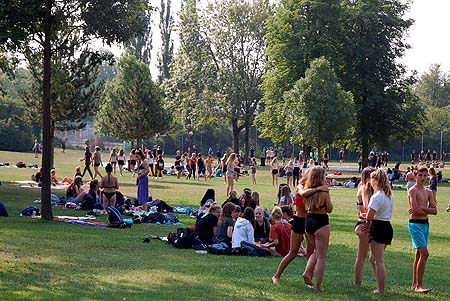 Die Schülerschaft hatte es sich schon auf dem Rasen klassenweise oder in kleineren Grüppchen gemütlich gemacht und sich auf den mitgebrachten Decken ausgebreitet. Hier konnte man ganz entspannt miteinander quatschen, Karten spielen, etwas essen, naschen oder trinken oder einfach nur relaxen und sich von der coolen Beach-Musik berieseln lassen, die im Bad erklang und für das passende Urlaubsfeeling sorgte.