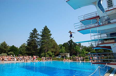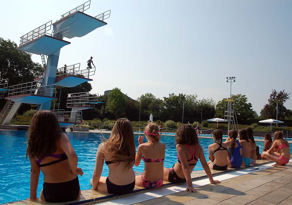 Als dem Höhepunkt des Vormittags fieberten alle dem großen Wassersprung-Wettbewerb entgegen: Vom Fünf-Meter-Brett aus galt es einen möglichst kreativen Sprung ins kühle Nass hinzulegen und tatsächlich hatten sich gut und gerne zwei Dutzend Kandidaten als Teilnehmer gefunden: Mädchen und Jungs wollten es wagen, Fünftklässler ebenso wie gestandene Q11-ler. Nur einige Wenige hatten vielleicht doch im letzten Moment Bammel bekommen und sich diskret von der Starter-Liste wieder streichen lassen.