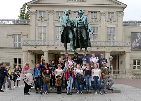 Ein Gruppenfoto vor dem Denkmal mit Schiller und Goethe ist in Weimar Pflicht.