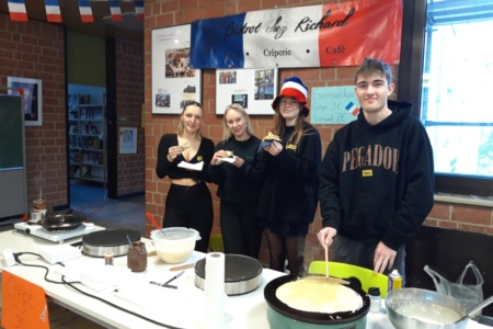 Das P-Seminar Französisch hatte im Vorfeld amüsante deutsch-französische Spiele erstellt, u.a. Monopoly, Vokabel-Dart, Activity, Memory und Kahoot, und begeisterte die Klassen und Lehrkräfte mit deutsch-französischen Lernplakaten und Tattoos. Für das leibliche Wohl war außerdem dank Croissants und Crêpes gesorgt. Eine großzügige Spende der in Mistelgau ansässigen Firma Hermos ermöglichte die Finanzierung des Events im Vorfeld. Danke – merci, et vive l’amitié franco-allemande!