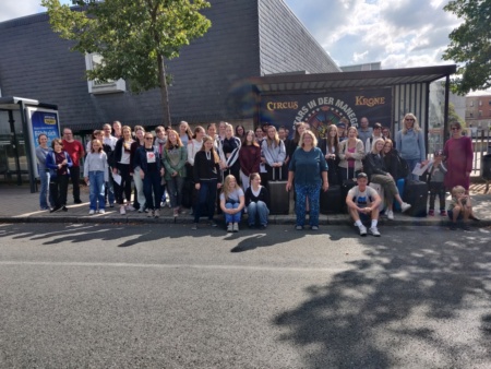 Nachdem die Gruppe der Pardubitzer am Sonntagnachmittag ankam, wurde sie in der Mensa von der Schulleiterin Frau Graf herzlich in Empfang genommen. Bei einer gemeinsamen englischsprachigen Schulhausführung in Kooperation zwischen unseren Schülerinnen der ILV und Frau Gerdes besichtigte die Gästegruppe das hauseigene Schulmuseum neben der Aula und staunte über die langjährige und sehr gut dokumentierte Schulgeschichte. Danke nochmals an unsere Zehntklässlerinnen, die unser Schulhaus mit allen Fachräumen und der Darstellung der Zweigwahlmöglichkeiten umfangreich und anschaulich präsentiert haben. Gleich im Anschluss konnte die tschechische Gruppe mit Frau Stock eine sehr ausführliche Stadtführung zur Geschichte und berühmten Köpfen von Bayreuth erleben. Unser Schlossturm zeigte allen einen schönen Rundumblick auf die spätherbstliche Stadt. Der Nachmittag war gefüllt mit einer bewegten und lehrreichen dreistündigen Sprachanimation der Organisation Tandem unter Frau Clausz, bei welcher schon erste Worte und Sätze auf Tschechisch von unseren deutschen GastgeberInnen gesprochen wurden.