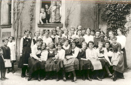 Klassenphoto vom Mai 1917. Im Fensterrahmen die Kinder des Hausmeisters, links Straßenkinder, die nur einfache Schürzen und keine Schuhe anhaben