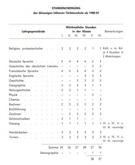 Stundentafel der sechsklassigen höheren Töchterschule ab 1900/01