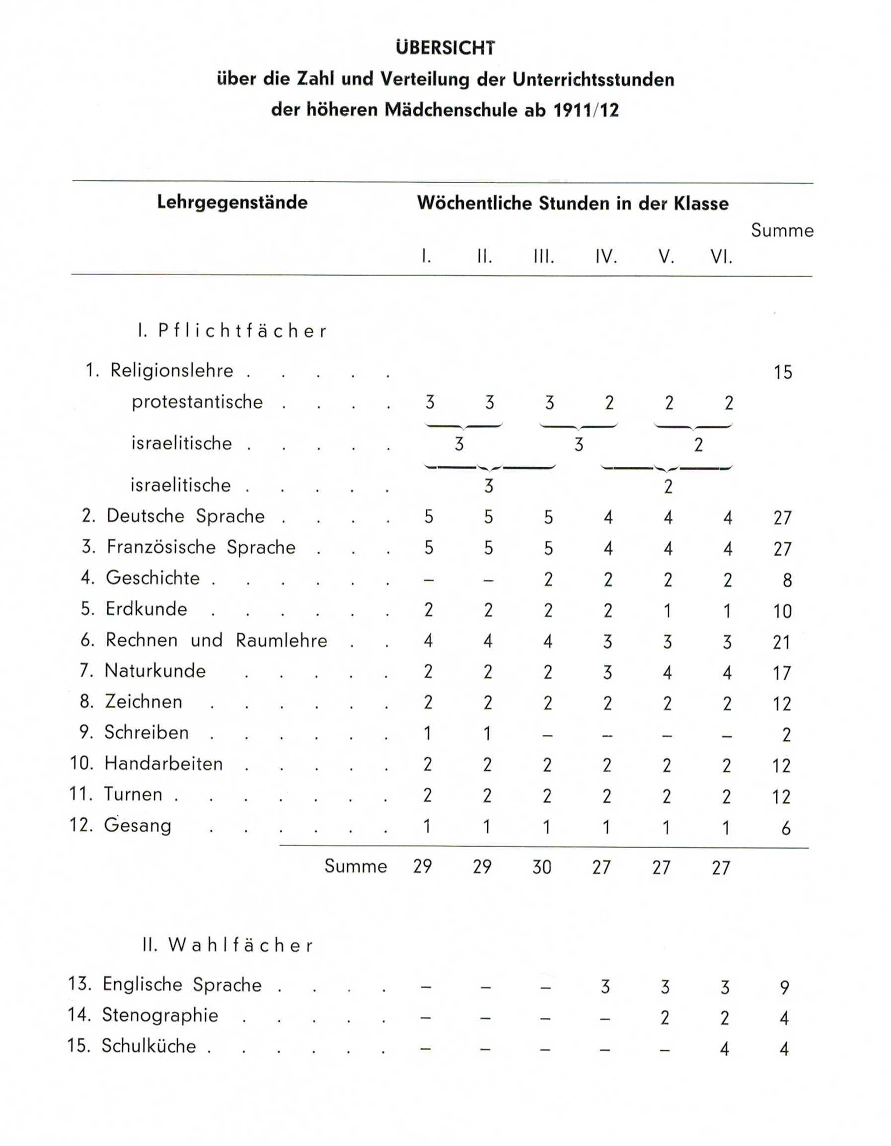 Stundentafel der höheren Mädchenschule ab 1911/12