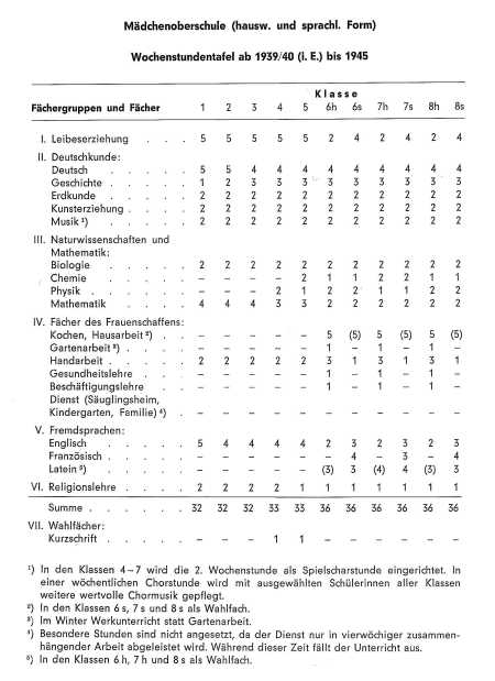 Stundentafel der Mädchenoberschule ab der Ernennung zum Gymnasium 1939/40 bis 1945