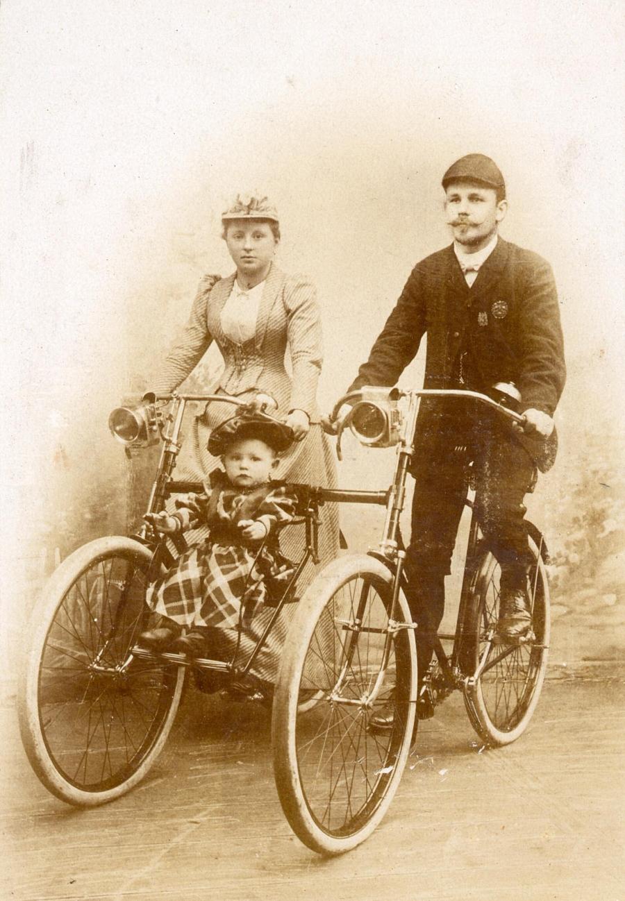 Conrad Hensel mit Frau Margarete und Tochter Johanna 1894 auf ihrem „Familienrad“. Bild: Stadtarchiv Bayreuth Sammlung Herterich
