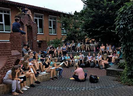 Als nun aber die Dunkelheit ausbrach, zog es sie in den Hofgarten. Weil nun aber die Lehrer bereits über einige Erfahrung im Umgang mit Geistern verfügten, konnten sie sie überzeugen, die nächtliche Ruhe nach 22.00 Uhr einzuhalten und ihnen wieder ins RWG zu folgen. Dort wurden sie in der Turnhalle gesammelt und gaben gegen 3:00 morgens endlich Ruhe.