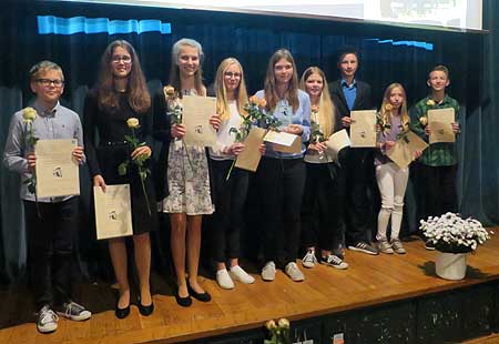Den Preis in der Kategorie „Mathematik und Naturwissenschaften“ ging an das „Jugend-forscht“-Team. Dazu gehören Julia von Ramm, Luca Derennek, Anne Fiebich, Theresa Griese, Theresa Reiß, Chris Pöhlmann, Luca Ossendorf und Clara Weidekamm. Sabine Fröber lobte ihren wissensdrang, ihre sympathischeArt und ihr großes Durchhaltevermögen, der Voraussetzung sei, Forschungen und aufwändige Experimente durchzuführen. Nur so sei es möglich gewesen, in den letzten Jahren viele Preise zu gewinnen.
