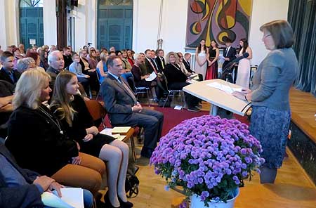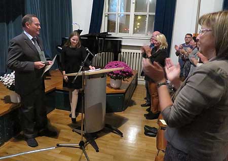 Für den künstlerischen Bereich würdigte Anne Gerdes die herausragenden Kunstarbeiten von Jennifer Hohnstein. Vor den Festgästen beschrieb sie, wie ihr Bild „Die Moldau“, mit dem sie am Europäischen Wettbewerb teilnahm, den europäischen Gedanken versinnbildliche.