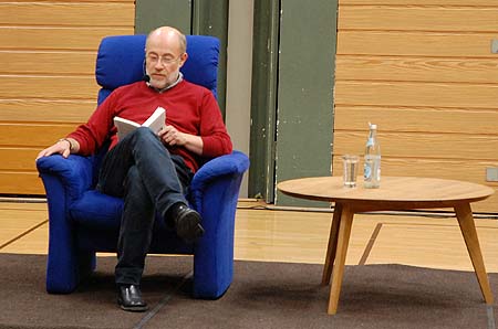 Schließlich kam der große Star leibhaftig, eher unscheinbar mit Karohemd, roten Pullover und ausgewaschener Jeans – ein Wissenschaftler zum Anfassen, der während seiner einstündigen Einmann-Show Wert darauf legte, weniger den Wissenschaftler hervorzukehren als den Entertainer – und ein bisschen auch den Selbstdarsteller. „Bescheidenheit ist die höchste Form der Eitelkeit“, gab er zu bedenken und kokettierte dabei charmant mit der eigenen Bildung.