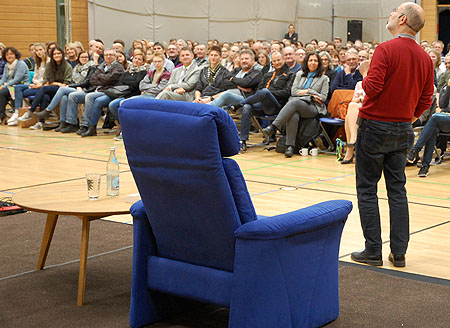 Zum flotten Vortrag gehörte auch eine flotte Sprache: Frei und ohne Manuskript formulierte Dr. Lesch salopp und griffig, anschaulich und auch mit drastischen Thesen: In der Öffentlichkeit gehe es immer mehr um Meinung als um Ahnung. Die aktuelle Klimadiskussion sei ein gutes Beispiel dafür. Deshalb seien gerade die Schulen wichtig, die es erlaubten, täglich neu am „Abenteuer Bildung“ teilzuhaben. Besonders die Lehrer im Publikum hörten es mit Freude.