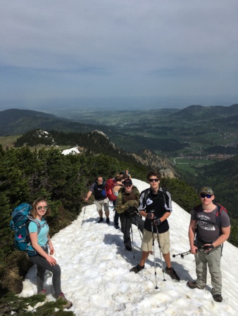 Nach einer vierstündigen Anreise kamen wir Sonntag gegen 11Uhr am Wanderparkplatz „Jägerkamp“ an. Ganz unter dem Motto: „Raus aus dem Auto, rein in die Wanderschuh!“ bereiteten wir uns und unser Gepäck vor. Um die ersten steilen Anstiege leichter meistern zu können, wurden uns freundlicher Weise leihweise Wanderstöcke von LEKI zur Verfügung gestellt. Unter wolkenfreiem Himmel, bei strahlenden Sonnenschein und dem einen oder anderen Schneeabschnitt unter den Füßen ging es zunächst nur bergauf bis wir gegen 13 Uhr am Gipfel angekommen unsere Brote zur Stärkung verzehren konnten und selbstverständlich auch den traumhaften Ausblick in vollsten Zügen genossen haben. Anschließend an die ausreichende Pause ging es weiter zu unserer Unterkunft, bei der wir erneut neben einem angenehmen Sonnenbad auf der Terrasse auch ordentlich unseren Durst löschen konnten, denn eins steht definitiv fest: Bei 6,2km und 730HM geraten auch die Sportlichsten ins Schwitzen!