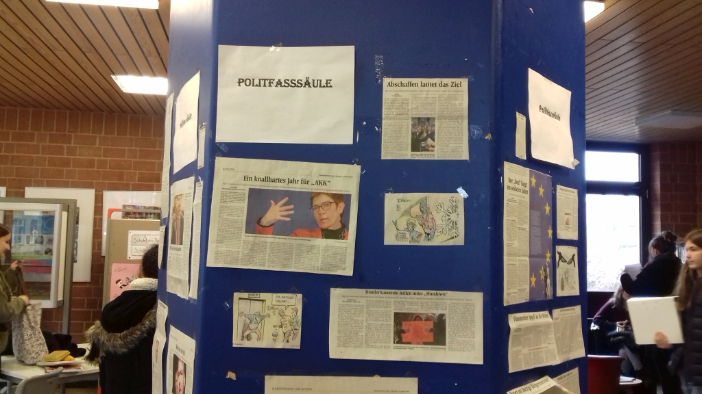 Als Sozialkundeklasse 10ae kümmern wir uns schon seit Anfang des Schuljahres um die Politfasssäule, die sich in der oberen Pausenhalle befindet. Unser Ziel ist es dabei euch dort über die neuesten politischen Ereignisse zu informieren.