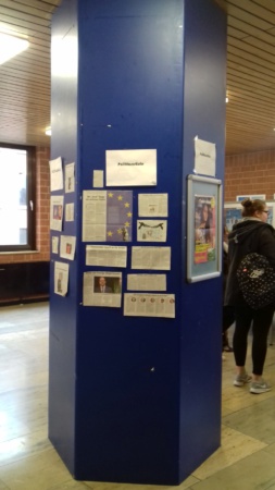 Die Politfasssäule in der Pausenhalle informiert über das aktuelle Politikgeschehen.