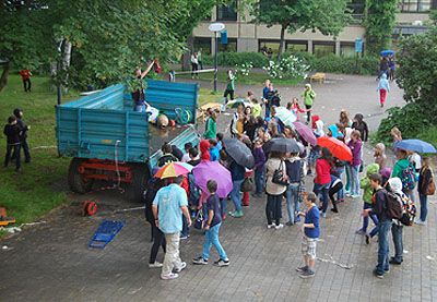 Trotzdem ließ sich die Q12 ihre letzte Gelegenheit für einen großen Auftritt nicht vermiesen, und auch einige tapfere Lehrer trotzen der Nässe, um sich auf einem eigens angekarrten Traktoranhänger an den Spielchen der Abiturienten zu beteiligen. So wurde es doch noch ein lustiger Vormittag, der den Schülern ein vorzeitiges Unterrichtsende bescherte und den Lehrern Gelegenheit zum Nachsitzen. Als längst schon alle weg waren, saßen sie bis tief in den Nachmittag hinein in einer Lehrerkonferenz in der Aula fest.