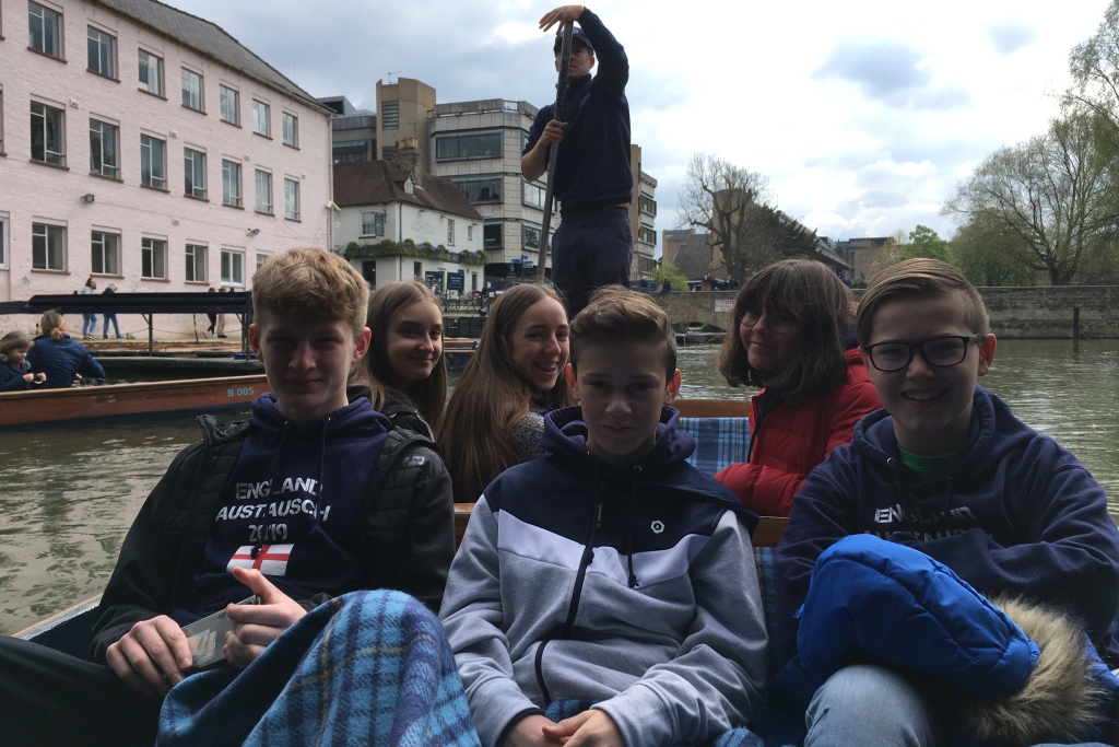 Nach emotionalem Abschied von den Gastfamilien und Austauschpartnern am Morgen des Rückreisetages machten wir uns wieder auf den Weg zum Flughafen. Auf dem Weg dorthin stand noch ein Zwischenstopp in Cambridge an. Frau Rupp und Herr Pensky führten uns durch die engen Straßen und erzählten uns so einiges über die Universitäten und die Stadt. Wir machten einen Abstecher in eine alte Kirche und als Überraschung stand dann „punting“ (eine Bootstour, bei der der Bootsführer das Boot mit einer langen Stange vorwärtsbewegt) auf dem Programm. Während der Tour erfuhren wir noch mehr Details über die „colleges“ und ihre Studenten. Zum Abschluss durften wir noch auf eigene Faust in kleinen Gruppen durch Cambridge bummeln. Danach hieß es „auf zum Flughafen“, wo wir nach strengen Sicherheitskontrollen in den Flieger stiegen. Nach der schönen und ereignisreichen Woche waren trotzdem alle froh, von ihren Eltern wieder in Empfang genommen zu werden.