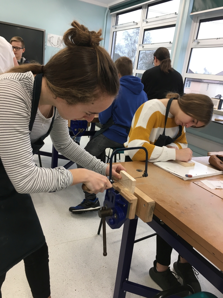 Montag tauschten alle ihre Erlebnisse und Eindrücke vom Wochenende aus. In der Schule entwarfen wir unsere eigenen Schlüsselanhänger aus Holz, die wir dann auch im Werkraum anfertigten. Nach mühsamen Sägen, Anmalen und mit Bienenwachs Versiegeln erstellten wir auch noch eine Verpackung, um unser Mitbringsel heile nach Hause transportieren zu können. Nach einer Mittagspause, welche wir in einem kleinen Park in der Innenstadt verbrachten, machten wir eine Stadt-Rallye, die gar nicht so leicht zu lösen war. Bei der Siegerehrung und Preisverleihung stellte sich dann aber heraus, dass wir gar nicht so schlecht abgeschnitten hatten.