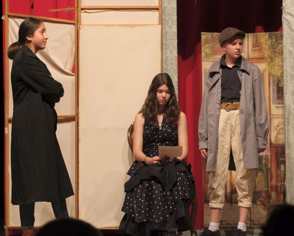 In diesem Jahr hatten die SchülerInnen der Theatergruppe der 8. / 9. Klasse die Ehre, mit ihrer Aufführung die 14. Bayreuther Schultheatertage eröffnen zu dürfen. Schon bevor der Vorhang aufging, konnte das Publikum einen Einblick in die Eingangshalle der Pension „Zum tanzenden Pony“, die ganz im viktorianischen Stil gehalten war, werfen. Hier deuten ein flammender Kamin, ein antiker Schreibtisch und ein schön geschnitzter Stuhl auf die heimelige Atmosphäre in der Pension hin. Doch das große Bild von einem zähnefletschenden Höllenhund, das inmitten dieses gemütlichen Ensembles thront, lässt die heile Welt zerplatzen und weist schon auf die Thematik hin, die für das kommende Geschehen bestimmend wird.