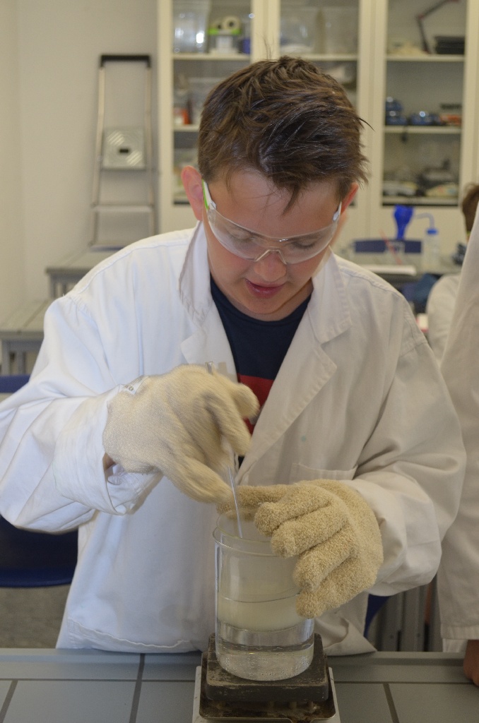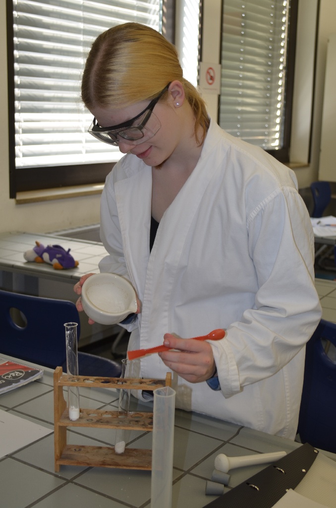 16 Schülerinnen und Schüler der 7. bis 10. Klassen nahmen im Schuljahr 2018/19 an dem Begabtenkurs „Chemieexperten“ teil und begaben sich auf Spurensuche quer durch die Naturwissenschaften. Im Fokus standen Untersuchungen zu den verschiedensten Materialien, die als Verpackung dienen können mit ihren Vor- und Nachteilen. Laut Wikipedia bezeichnet eine Verpackung im Allgemeinen die Hülle bzw. (die partielle oder vollständige) Umhüllung eines Objektes insbesondere zu dessen Schutz oder zur besseren Handhabung. Da lag es natürlich auf der Hand, dass sich alle Kursteilnehmer an der Internationalen Junior Science Olympiade mit dem Thema „Rund um das Ei – das Ei als geniale Verpackung aus der Natur“ beteiligten. In den Laborräumen der Chemie aber auch zu Hause wurde bis Januar rund um das Ei recherchiert und experimentiert. Alle 16 Teilnehmer reichten ihre Forschungsergebnisse rechtzeitig ein. Vier Schülerinnen qualifizierten sich dann für die zweite Wettbewerbsrunde und die Schülerin Vanessa Erlmann erreichte so gute Ergebnisse, dass sie auch die dritte Runde noch bestreiten konnte und in ein IJSO Trainingscamp als Auszeichnung eingeladen wurde.