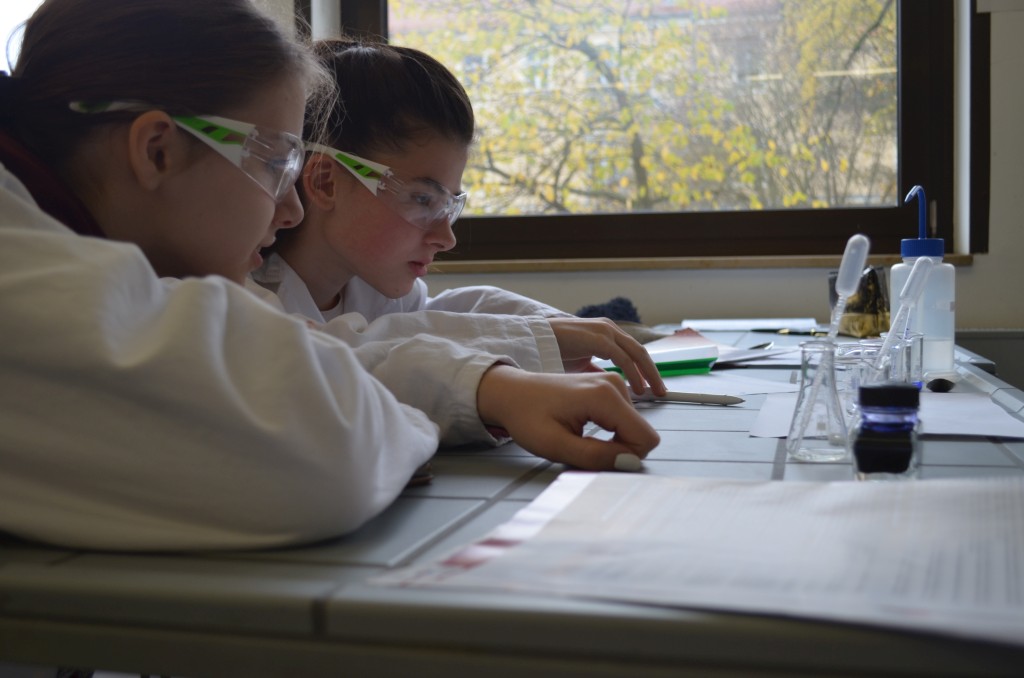 Am ersten Kurstag stand die Füllertinte im Fokus der chemischen Experimente. Mit großem Eifer wurden Tintenkiller und Tintenpatronen zersägt, um die Inhaltsstoffe näher zu untersuchen und Tests mit ihnen durchzuführen. Die Beobachtungen wurden protokolliert und in einer Forschungsarbeit ausgewertet und diskutiert. Ziel ist die Teilnahme an der diesjährigen JuniorScienceOlympiade.