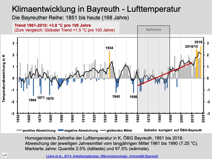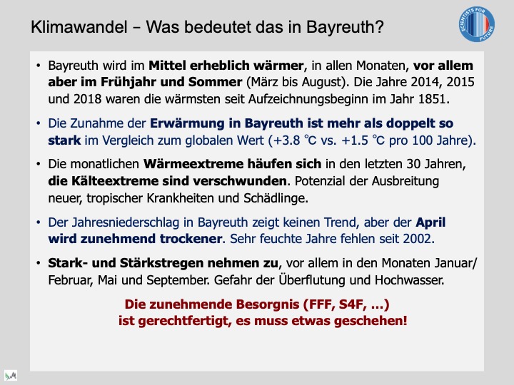 Da kam das Angebot von Herrn Dr. Lüers von der Abteilung Mikrometeorologie der Uni Bayreuth gerade richtig, von den Forschungsergebnissen des Lehrstuhls zu den Auswirkungen auf die Stadt Bayreuth und das nähere Umland anzubieten.