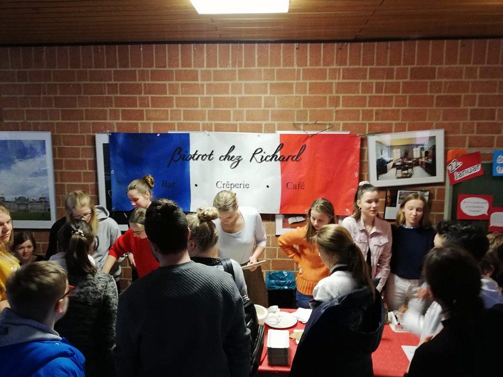 Das RWG mischte dieses Jahr kräftig mit: Mit einem dicht belagerten Crêpes-Stand in der Oberen Pausenhalle, an dem fleißige Schülerinnen der Q11 ab der 1 Pause leckere Crêpes mit Nutella und Zimtzucker verkauften. Die bis in den Gang reichende Schlange bewies den Erfolg dieser Aktion – gegen Ende hin musste sogar noch Teig nachgemacht werden. Die Französischlehrer nutzen ihre Stunden, um mit ihren Klassen die Obere Pausenhalle zu besuchen, wo es außer Crêpes auch noch ein Quiz über unser Nachbarland, Infos zu den deutsch-französischen Beziehungen und französische Zungenbrecher zum Ausprobieren gab. Wer wollte, konnte sich die Tricolore ins Gesicht schminken lassen. Etliche zufrieden schmatzende und bleu-blanc-rouge bemalte SchülerInnen liefen einem an diesem Tag über den Weg. Der Erlös des Crêpes-Verkaufes kommt nicht nur der Q11 zugute, sondern auch dem Benin-Projekt der Klasse 6e, die bereit seit letztem Jahr das Waisenhaus „La Paix“ in Natitingou unterstützt, sowie der Fachschaft Evangelische Religion für das „Pangani Lutheran Children Center“ in Nairobi.
