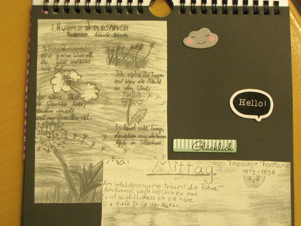 Als ersten Schritt hatte Frau Track eine Vorauswahl an kurzen Gedichten unterschiedlicher Autoren getroffen und diese bereits ausgedruckt; das Thema lautete „Jahreszeiten“. Da die Klasse aus 23 Kindern (und einer Lehrerin) besteht, waren exakt je zwei Gedichte für einen Monat gedacht. Jeder aus der Klasse durfte sich ein Gedicht aussuchen, das er dann sauber auf ein DinA5-Blatt abschrieb; beim Übertragen war also Genauigkeit gefragt und auch ein bisschen künstlerisches Talent – denn im Anschluss sollte das Gedicht zusätzlich noch mit passenden Bildchen zur jeweiligen Jahreszeit verziert oder aber beklebt werden. Hierbei waren der eigenen Kreativität und Phantasie keine Grenzen gesetzt!