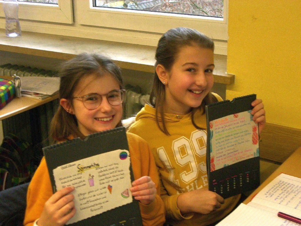 Schließlich konnten sich zuhause Eltern, Großeltern und natürlich die Schüler/innen selbst über den besonderen Kalender freuen. Und das Projekt hatte noch etwas bewirkt in der Klasse: Die Kinder hatten nochmals mit ihrer Deutschlehrerin die Grundkenntnisse über das Gedicht (z. B. die Reimarten, das Metrum etc.) wiederholt; außerdem sollte jedes Kind zum Abschluss noch sein Gedicht auswendig und sinntragend betont vor der Klasse vortragen. Somit wurde am Ende jeder mit einer guten Note für die gelungene Präsentation belohnt!