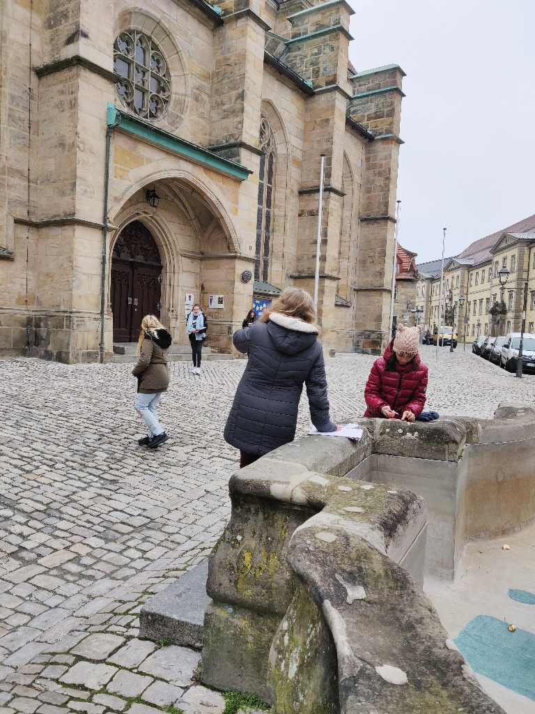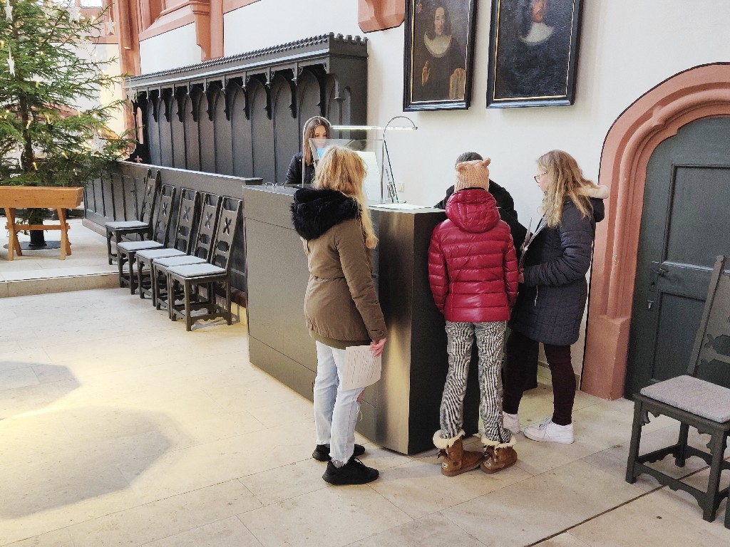 Zu Beginn des Schuljahres erkundete die Klasse 7a im Kunstunterricht die Architektur der Stadtkirche, einem Ort an dem wir uns als Schulgemeinschaft zu Beginn des Schuljahres, an Weihnachten und zum Schuljahresende immer wieder einfinden. Der Blick auf ein Gebäude verändert sich, wenn man es sich einmal genauer anschaut. Da waren die Schritte zu zählen, die es braucht, um das Gebäude zu Umrunden. Auch die Höhe wurde anhand der eigenen Körpergröße geschätzt, Figuren sollten an der Fassade gezählt und beschrieben werden. Die Frage, was denn nun Gotik sei und inwiefern sie sich von der Romanik unterscheidet, wurde auch an Beispielen wie der Gewölbe- und Deckenkostruktion im Inneren diskutiert. Begleitet wurde unsere Arbeit durch das Orgelspiel des Organisten, der einigen ganz wissbegierigen Schülerinnen die Funktionsweise der neuen Orgel erläuterte. Im Anschluss wurde eine zeichnerische Arbeit vor Ort zum Thema „Ornament“ gefertigt.