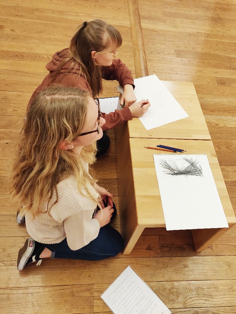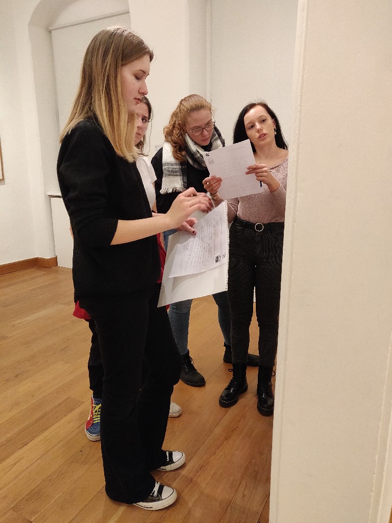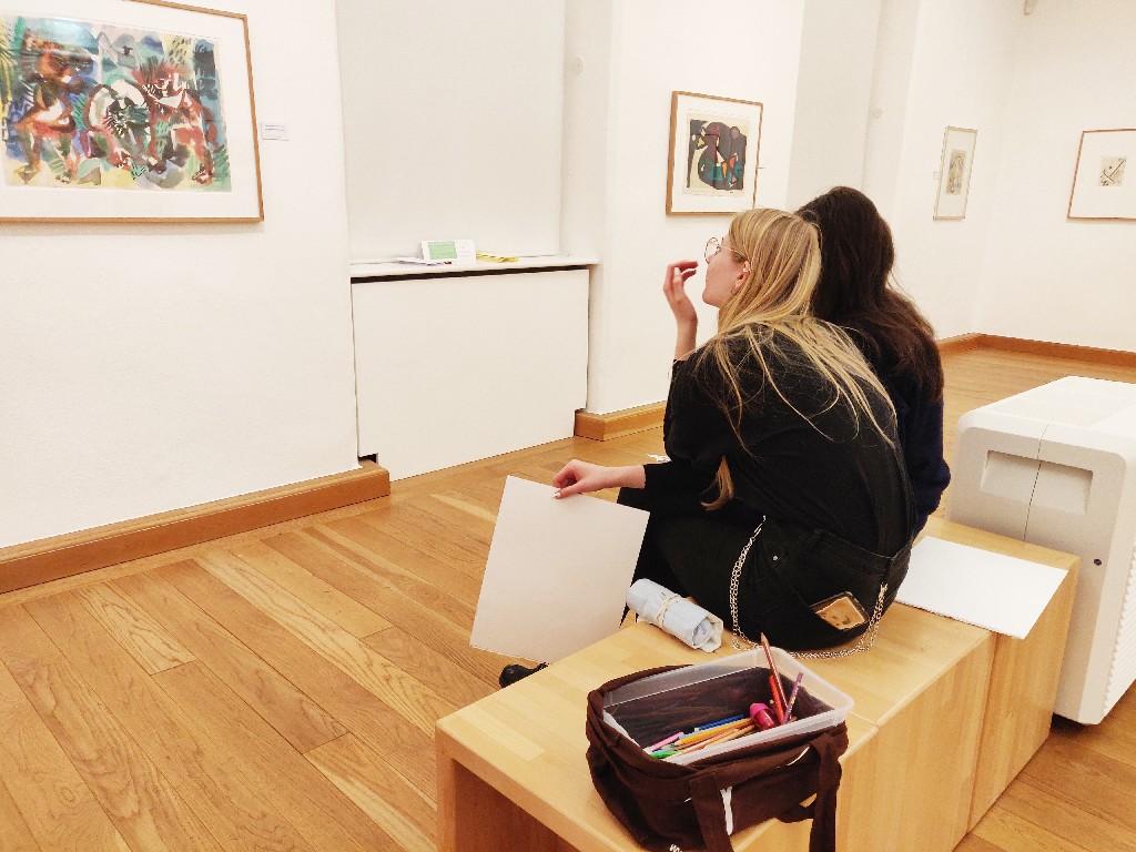 Am darauffolgenden Dienstag besuchte eine Gruppe von 11Klässlern ebenfalls das Museum, sie erhielten zeichnerische Arbeitsaufträge vor den Originalen und informierten sich anhand von Impulsaufträgen über die Künstler und deren Gestaltungsideen. Eine Reihe von originellen Zeichnungen entstand im Stehen, Sitzen und sogar im Liegen.