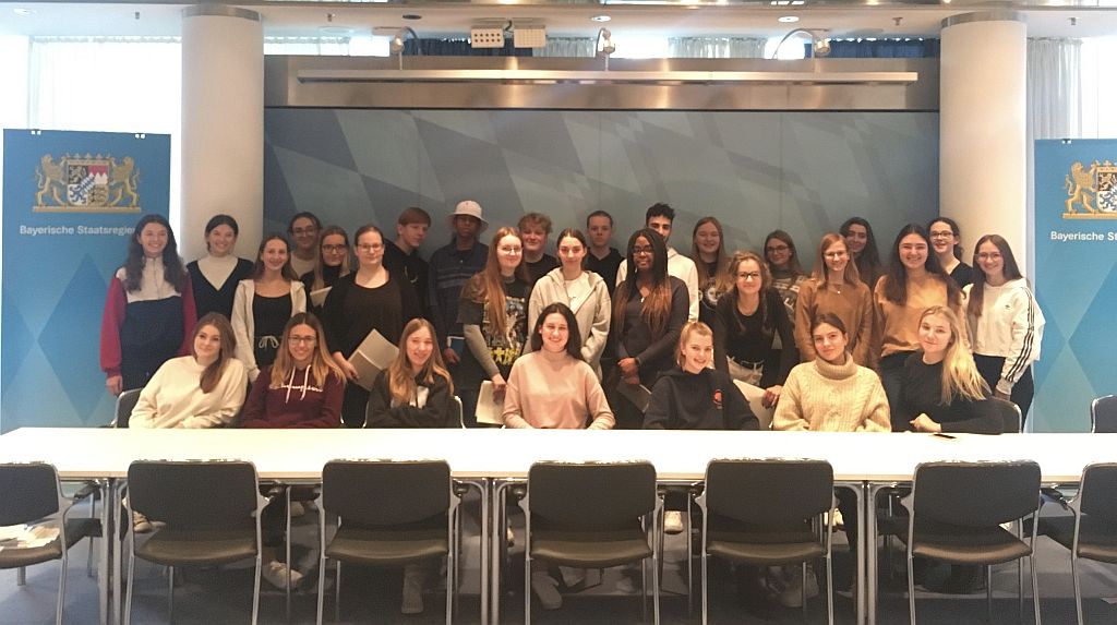 Am 18. Dezember 2019 fuhren 33 Schülerinnen und Schüler der Jahrgangsstufe 10 aus dem sozialwissenschaftlichen Zweig nach München, um im Rahmen des Projekts „Lernort Staatsregierung“ die Staatskanzlei zu besuchen. Nach der Ankunft an der Staatskanzlei und der Sicherheitskontrolle, die jede*r durchlaufen musste, konnten sich alle Schülerinnen und Schüler, sowie die begleitenden Lehrkräfte, durch einen kleinen Imbiss stärken. Anschließend gab es durch zwei Vertreter der Landeszentrale für Politische Bildung, von denen Herr Müller die Gruppe den ganzen Tag über durch das Programm führte, eine Einführung in die Struktur und Aufgaben der Staatskanzlei. Nach dem Einführungsvortrag erfolgte eine kurze Begehung der Staatskanzlei. Das erste von drei Gesprächen mit Mitarbeiter*innen der Staatskanzlei ging über den Bereich Wirtschaftspolitik und besonders die aktuellen Herausforderungen in diesem Bereich, wobei gerade auch die Themen Umweltschutz und Nachhaltigkeit eine große Rolle spielten. Weiterhin gab es eine Gesprächsrunde mit einer Mitarbeiterin aus dem Referat für Internationale Beziehungen. Schwerpunkte waren hierbei die Gründe, warum Bayern eigenständige Beziehungen mit anderen Nationen unterhält und welche Beziehungen von besonderer Bedeutung sind. Aber auch aktuelle Herausforderungen in der internationalen Politik wurden diskutiert.
