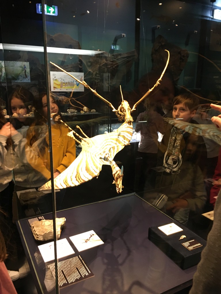 Neben Tieren aus der Eiszeit wie den Höhlenbären konnten die Schüler auch echten Saurier-Skeletten begegnen, die alle in Tongruben der Region gefunden wurden, z. B. denen der Giraffenhalssaurier, der Fischsaurier oder sogar der einzigartigen Flugsaurier aus Mistelgau „Dorygnathus mistelgauensis.“