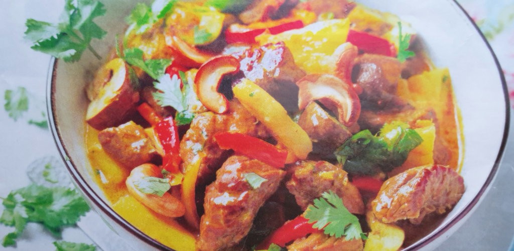 Das Fleisch mit Salz und Pfeffer würzen, die Currypaste einrühren, Kokosmilch zugeben und alles bei mittlerer Hitze ca. 20 Minuten köcheln lassen.