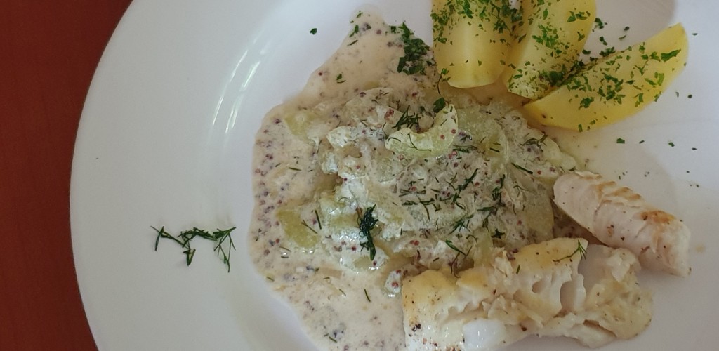 Das Gurkengemüse mit Dill bestreuen und mit dem Fisch auf einem Teller anrichten.