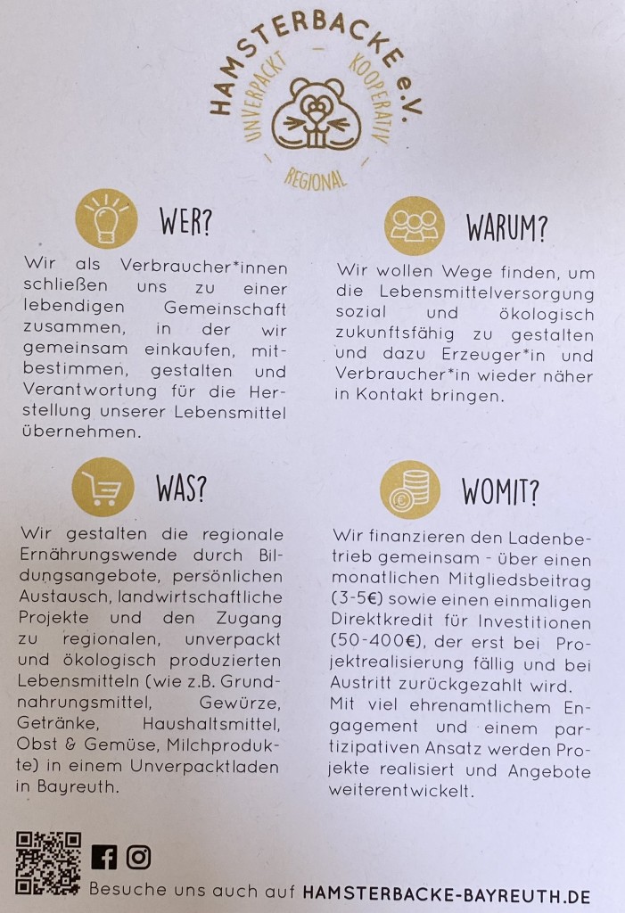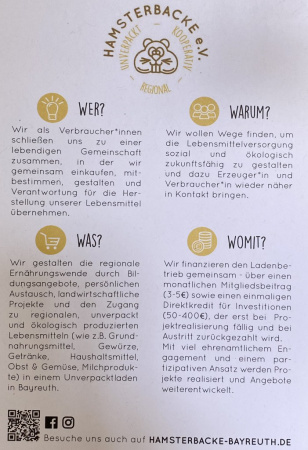 Der Verein beschäftigt sich explizit mit diesen Themen, wobei wir durch Recherchearbeiten, Erstellung von Infoplakaten und eines Werbefilms und Gestaltung des Socialmedia-Auftritts mitwirken. Die Hamsterbacke e.V. hat es sich zur Aufgabe gemacht einen Beitrag zur Lebensmittelversorgung der Zukunft zu leisten, und setzt das in Form eines ersten Unverpackt-Ladens in Bayreuth um. Dabei wollen sie vor allem erreichen, dass die Menschen ihre Lebensmittel wieder regional, ökologisch und kooperativ beziehen. Leider war es uns aufgrund des Coronavirus in letzter Zeit nur begrenzt möglich den Verein bei der Errichtung des Ladens im zu unterstützen, dennoch ist es unser Anliegen euch hier über den Verein und dessen Laden zu informieren. Der Laden ist seit Donnerstag, den 18.06. am Hohenzollernring 67 in Bayreuth geöffnet, allerdings aufgrund der anhaltenden Einschränkungen durch das Coronavirus zunächst nur für Mitglieder des Vereins um einen „Probelauf“ durchzuführen. Falls ihr noch genauere Infos zu der offiziellen Eröffnung oder anderen Projekten der Hamsterbacke e.V. sucht, findet ihr diese auf deren Website: www.hamsterbacke-bayreuth.de