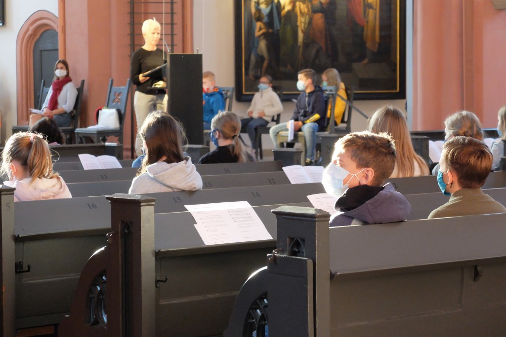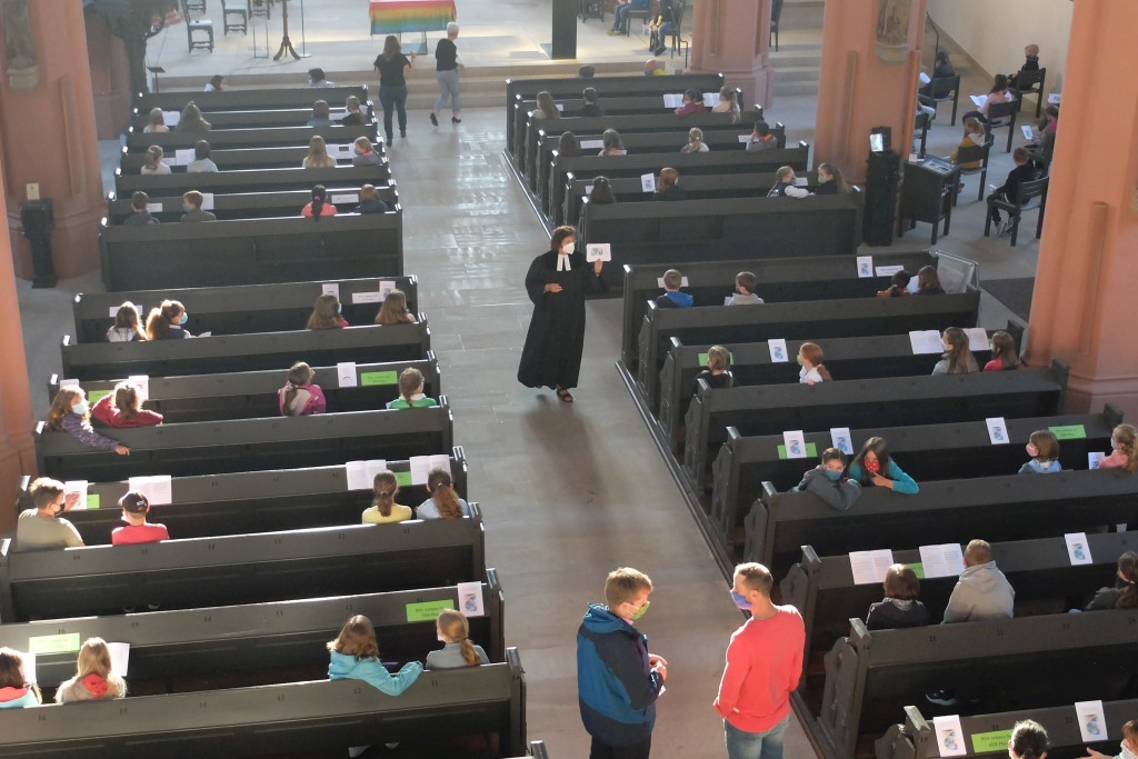 Mit dem Anfangsgottesdienst, der für die 5. Jahrgangsstufe in der Stadtkirche und für die Größeren via Panel digital in der Schule stattfindet, beginnt der zweite Tag, an dem viele vielleicht zunächst zaghaft, aber dann mit großer Erleichterung feststellen können, dass die neuen Lehrer*innen ebenso wie die unbekannten Sitznachbar*innen eigentlich ganz nett sind und das Schulhaus dann doch nicht so groß ist…