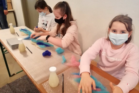 Die Kinder staunten nicht schlecht, als sie erfuhren, wie hart und anstrengend das Leben der Bauernfamilien in einer Zeit ohne Traktoren und andere moderne Maschinen gewesen ist. Um einmal selbst zu erleben, welche Aufgaben die Kinder der Bauernfamilien früher erledigen mussten, lernten die 5.Klässer die Technik des Filzens kennen und stellten Stifthüllen her, die sie dann auch mit Nachhause nehmen durften.