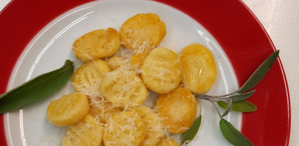 Butter in der Pfanne flüssig werden lassen, Salbeiblätter zugeben und die Gnocchis in der Pfanne schwenken.
