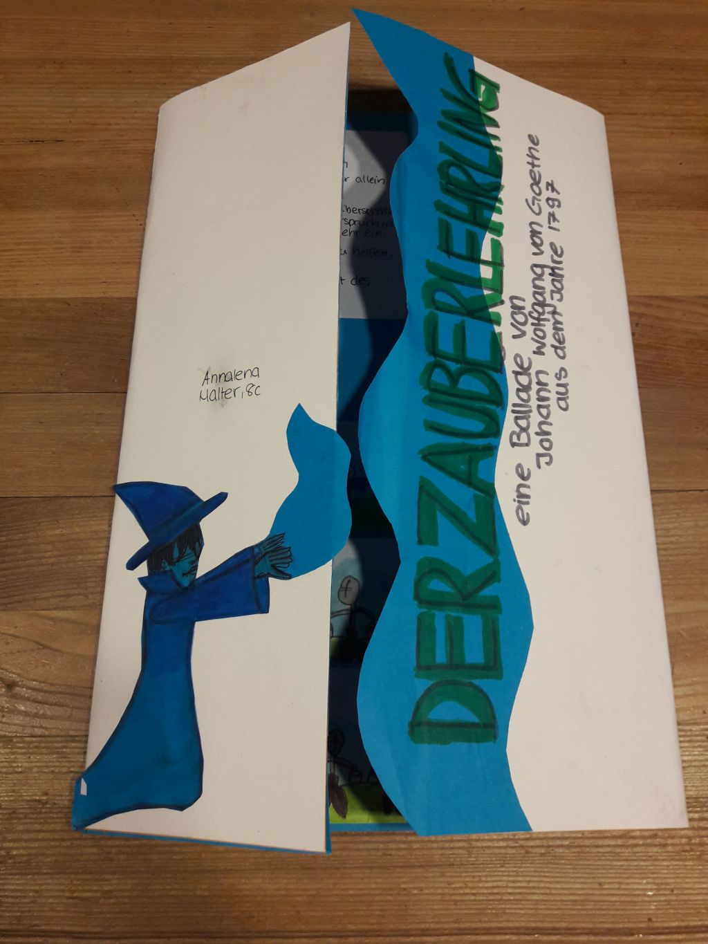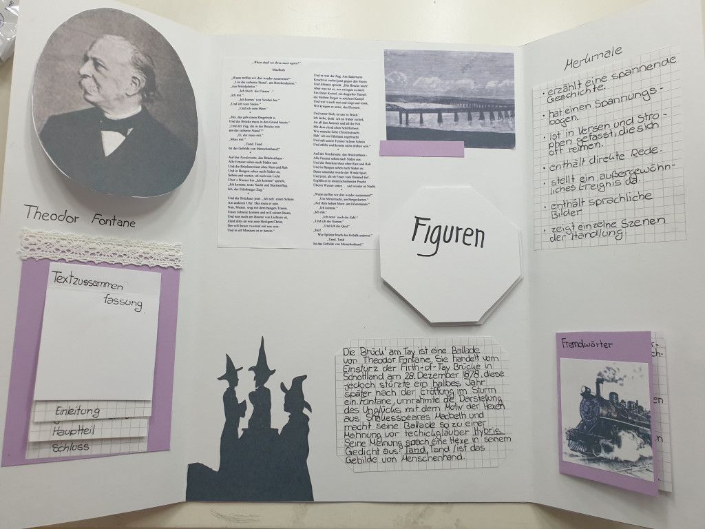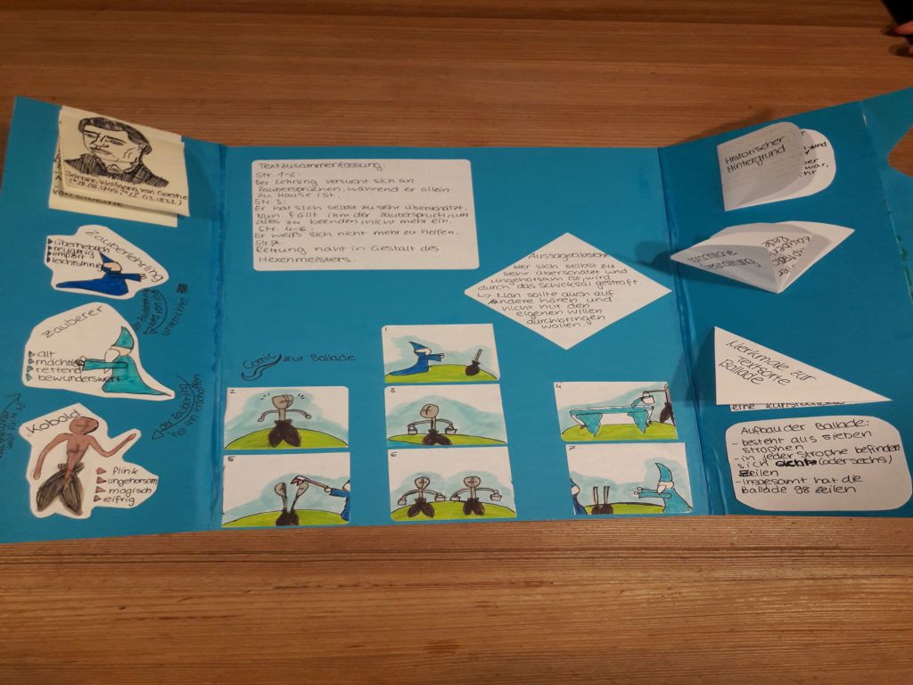 Die informierende Schreibform des Zusammenfassens von Texten wurde nicht nur durch das eigenständige Verfassen weiterer Inhaltsangaben zu ausgewählten Balladen in Gruppenarbeit vertieft; die Schüler/innen sollten zudem ein Lapbook zu ihrer bearbeiteten Textgrundlage erstellen – Letzteres war v.a. in der Phase des Distanz- bzw. Wechselunterrichts ideal zu bewerkstelligen! Zur Auswahl standen dabei u.a. Goethes „Der Zauberlehrling“, Fontanes „Die Brück` am Tay“, , Kästners „Der Handstand auf der Loreley“ oder Fühmanns „Lob des Ungehorsams“.