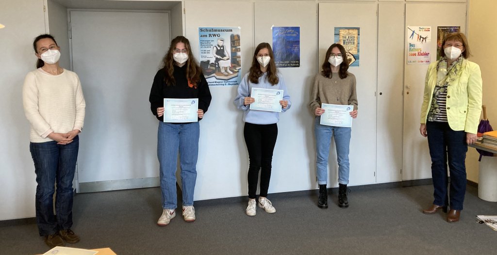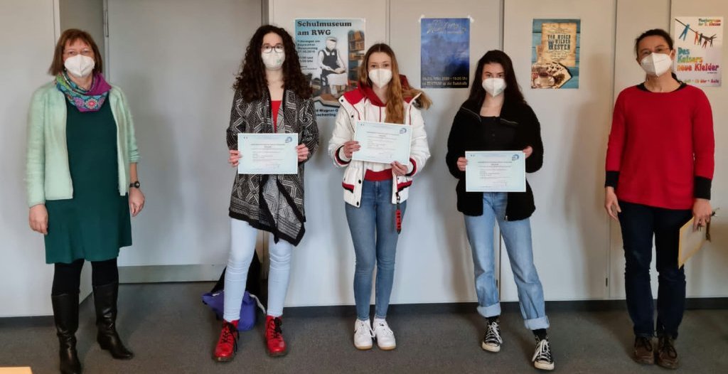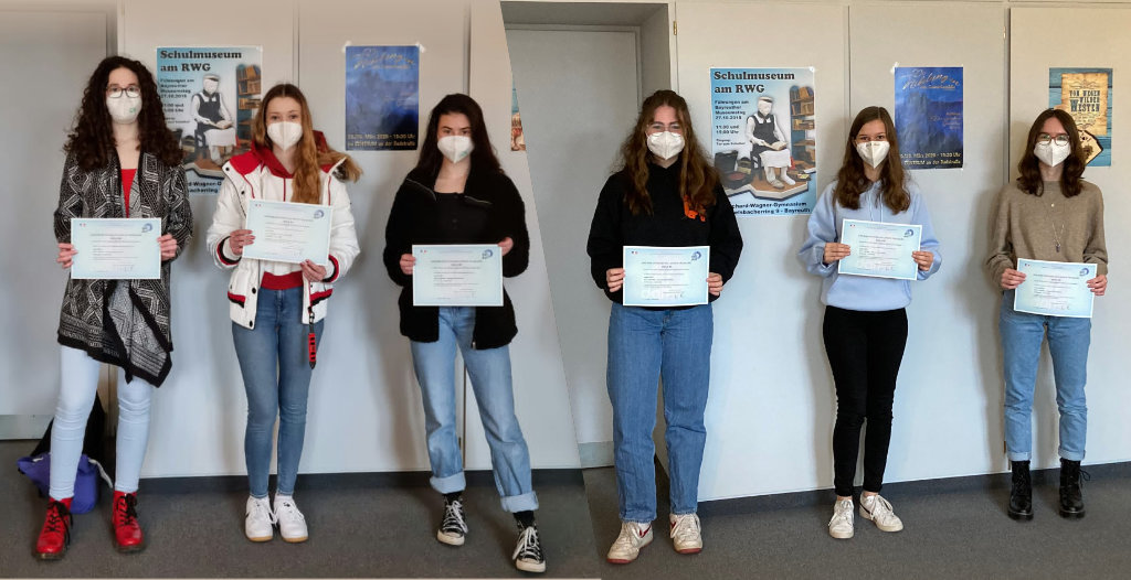 Unsere Schülerinnen der 10. Jahrgangsstufe haben das Niveau B1 des Europäischen Referenzrahmen für Sprachen ablegt. Ihre Französischkenntnisse wurden durch eine Reihe von anspruchsvollen Aufgaben in den vier Kompetenzbereichen – Hör- und Leseverstehen, mündlicher und schriftlicher Ausdruck – auf Herz und Nieren geprüft. Geübt und vorbereitet wurde in einem wöchentlich stattfindenden Kurs, und unsere Kandidatinnen waren trotz der pandemiebedingten Unterbrechungen und der Verschiebung des Prüfungstermins immer mit großem Fleiß und Eifer dabei. Alle sieben können sehr stolz auf ihre Ergebnisse sein. Deswegen gratulieren wir und sagen: Hut ab! – Chapeau, mesdames!