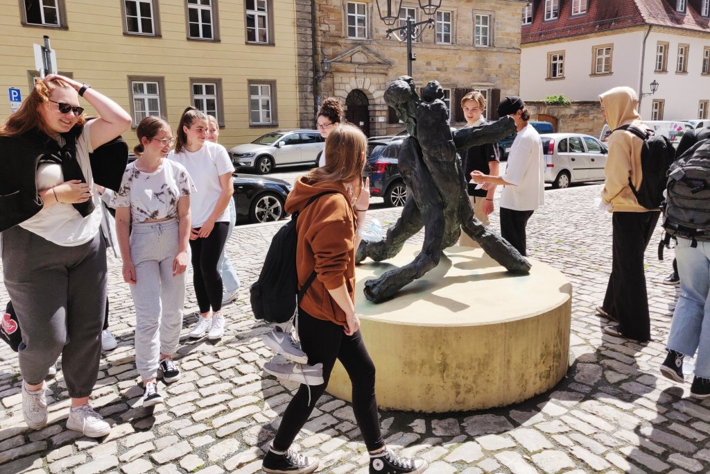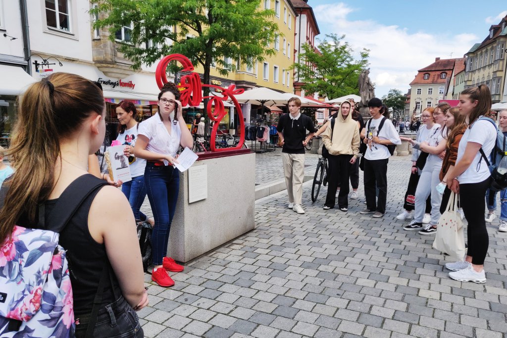 Endlich ging es los. Die SeminaristInnen des W-Seminars „Stolpern über Kunst“ begannen am Dienstag mit ihren Vorträgen in der Stadt Bayreuth, bei denen sie sich entlang der Bayreuther Skulpturenmeile vortasteten und bei sehr sommerlichen Temperaturen direkt neben Frederik Reuterswärders rotem „Non Violence“ Revolver das wohlverdiente Eis zum Abschluss der ersten Runde gönnen konnten.