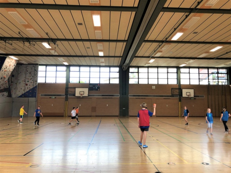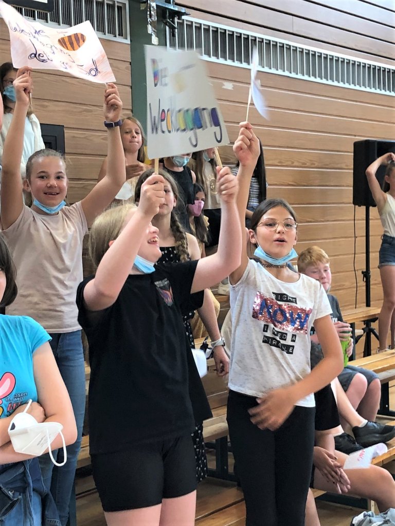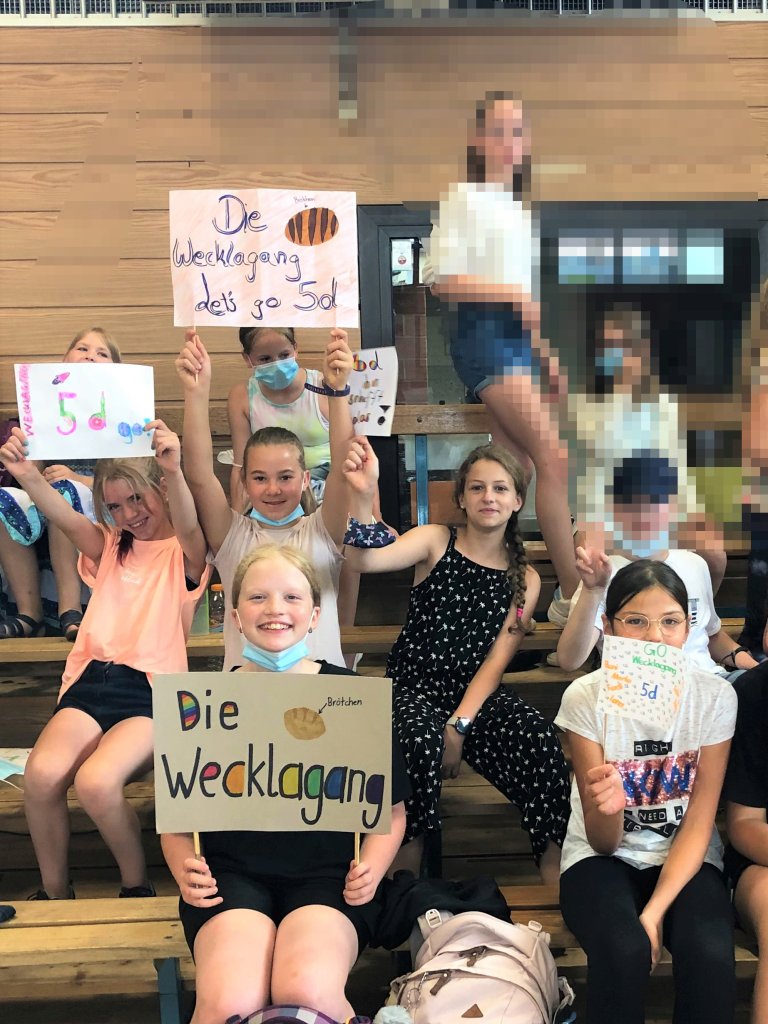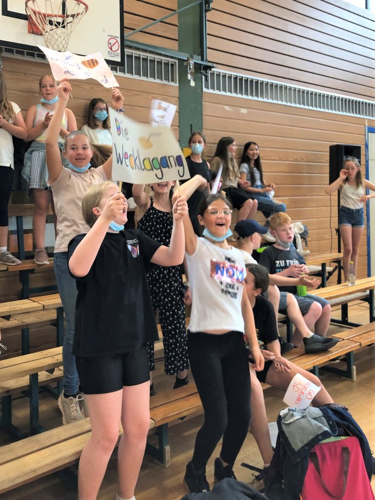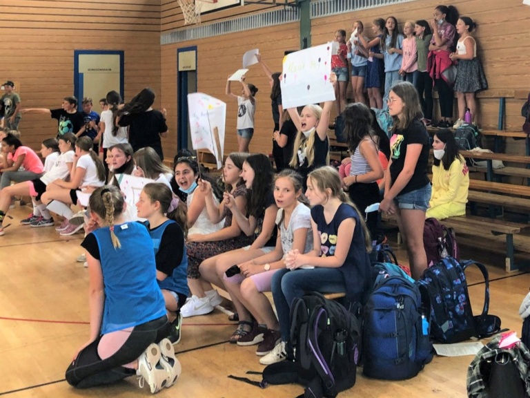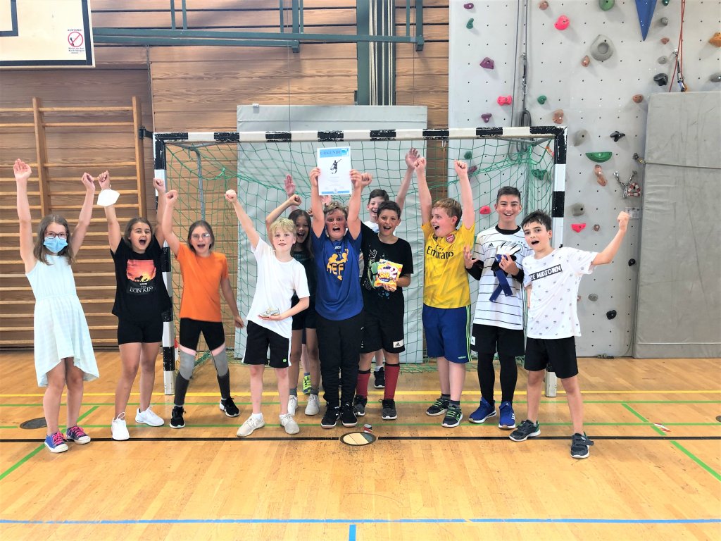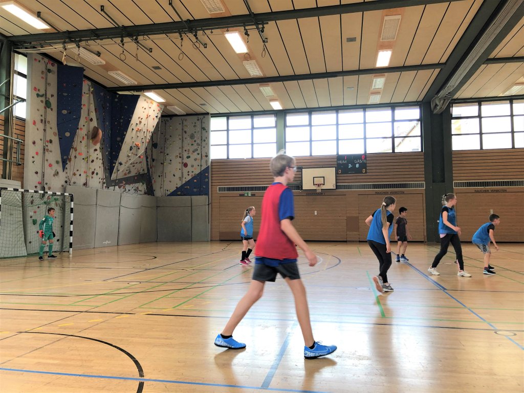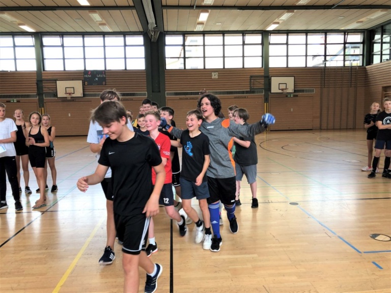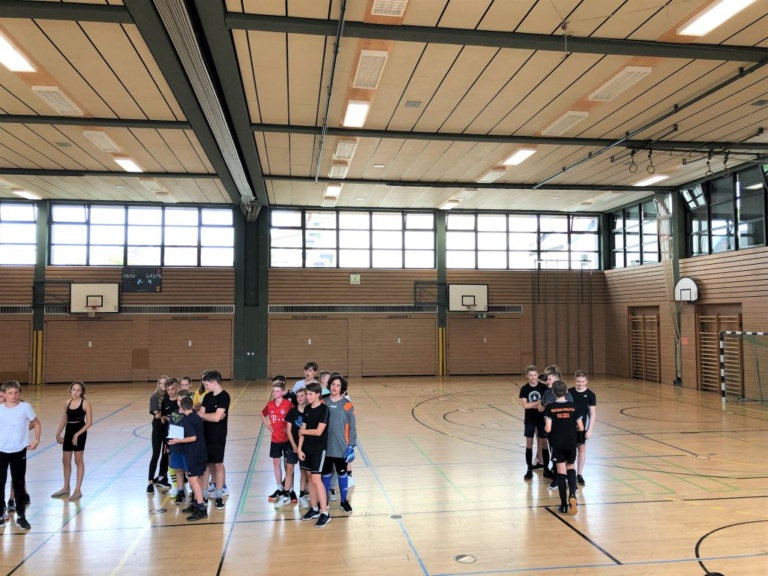 Die Stimmung war den ganzen Vormittag gut, sie steigerte sich aber durchweg und fand ihren Höhepunkt bei den Spielen der 5. Klässler. Mit lautstarken Anfeuerungsrufen fieberte das Publikum mit und versuchte seine Teams zu unterstützen. Einige Fans hatten auch Plakate gebastelt – zum Finale gegen 12:40 Uhr bebte die Halle. Sieger der 5. Klassen wurden die „Brotzeitboxen“ der Klasse 5e.