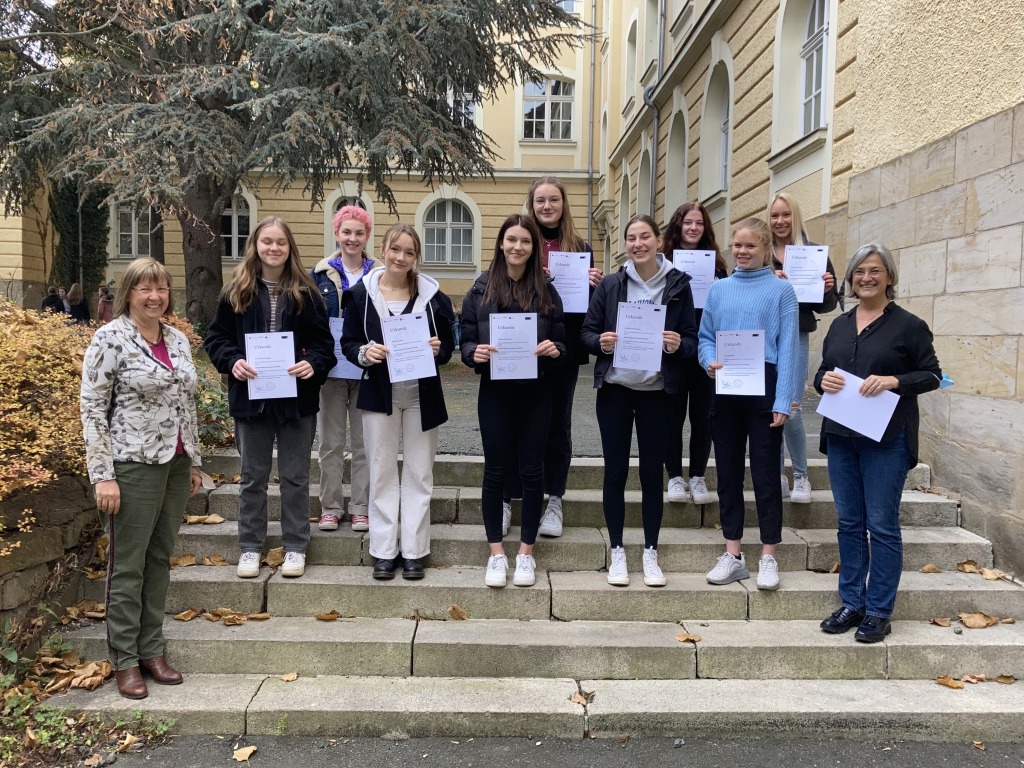 OStDin Graf und StDin Wenger bedanken sich bei den Schülerinnen der Q11, die die Juniorwahl organisiert und durchgeführt haben, und verleihen ihnen ihre Urkunden.
