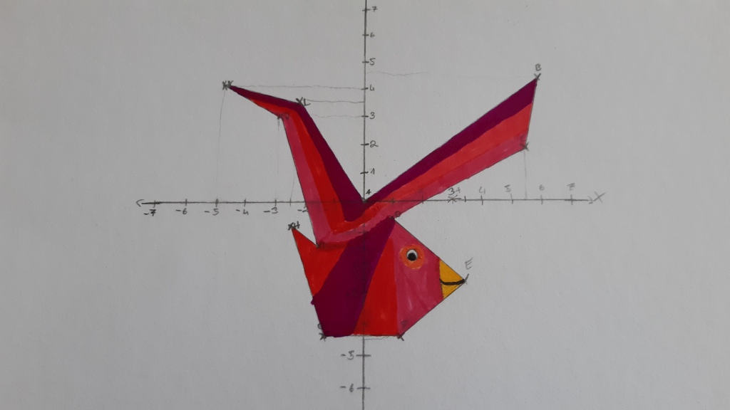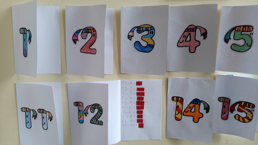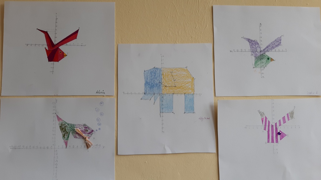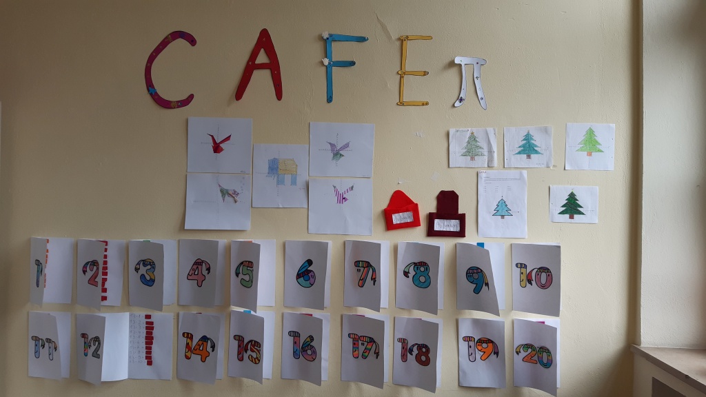 Einige Kunstwerke entstanden durch das Bemalen von Koordinatensystemen, für die die Schüler vorher rechnen mussten: Es entstanden Elefanten, Fische oder auch Lebkuchenmänner. Damit die Kinder im Café π das Winkelmessen üben können, wurden große Winkel für die Wand vorbereitet, die mit dem Tafel-Geodreieck gemessen werden können. Auch die Vorgehensweise wird auf einem Plakat erklärt. An einer anderen Station wurde ein interaktiver Wandkalender zum Einmaleins üben gestaltet. Alles wurde mit viel buntem Papier und ein wenig Glitzer zum Leuchten gebracht.