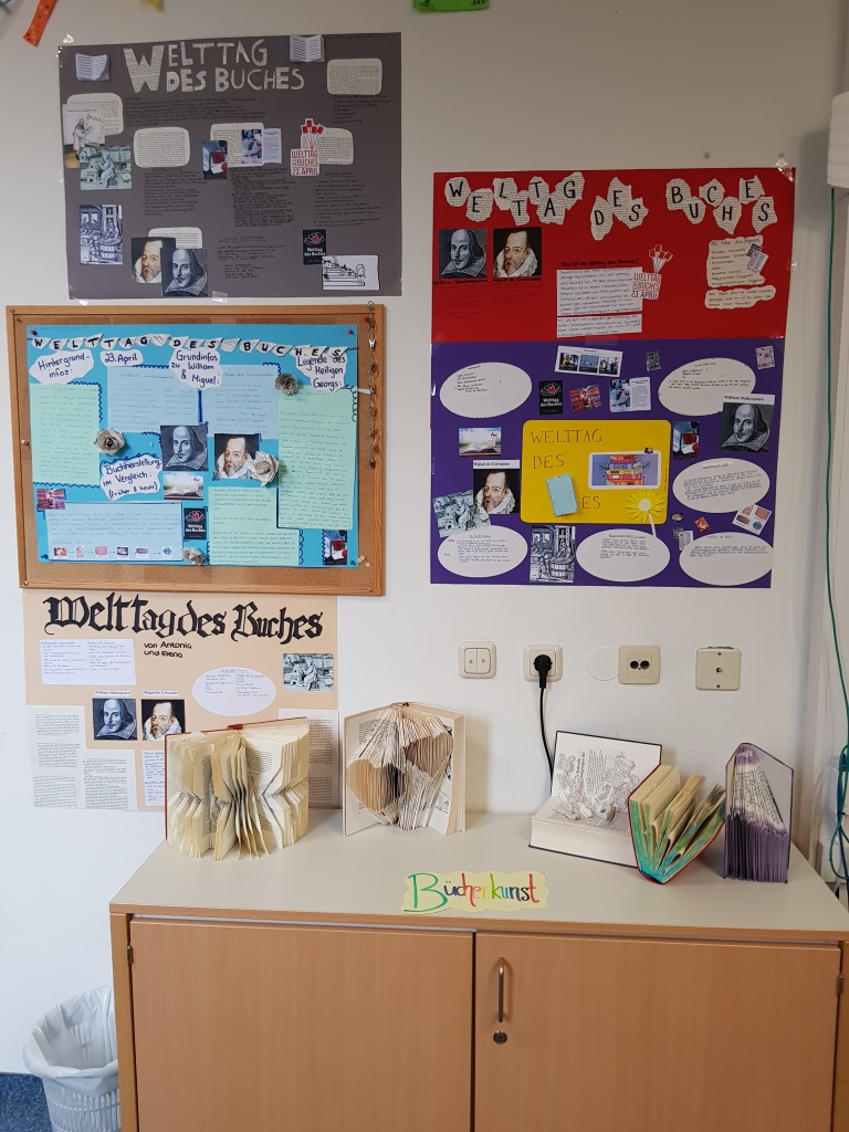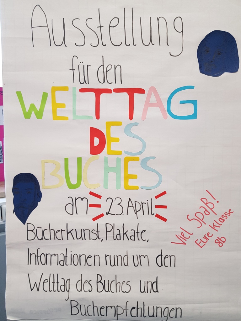 Anlässlich des Welttags des Buches, der am 23. April stattfindet, haben wir im Lesenden Klassenzimmer eine kleine Ausstellung vorbereitet. In dieser geben wir euch Buchtipps sowie Informationen rund um den Welttag des Buches und stellen euch verschiedene Buchkunstwerke vor. Wir würden uns freuen, wenn ihr vorbeischaut.